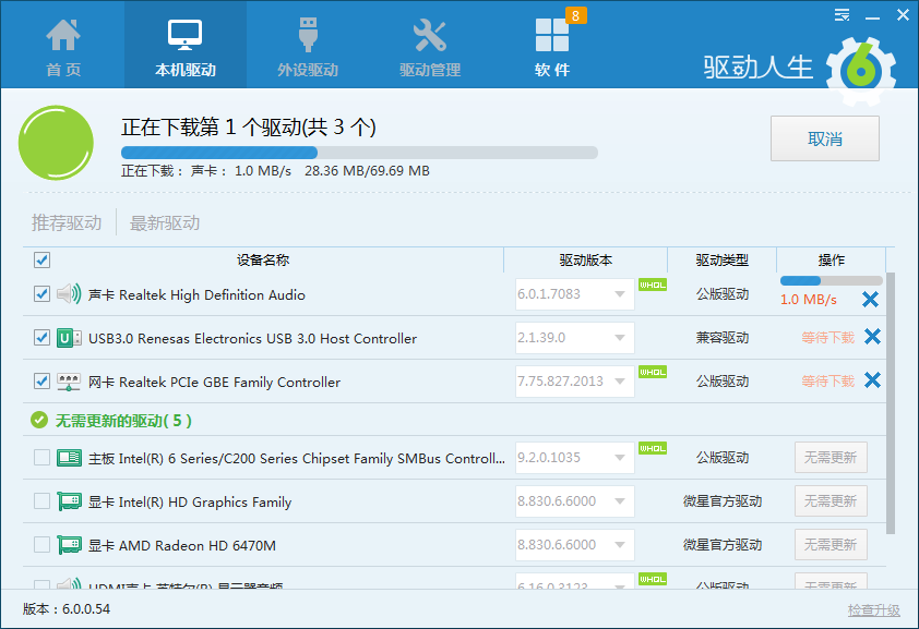 驅動人生6版本非常易用,采取“一鍵檢測”式邏輯結構進行設計,全自動檢測當前系統類型和判斷驅動缺失情況,全程用戶只需要點擊一個按鈕便可完成驅動安裝,連“小白”用戶也不會無所適從,按下“一鍵安裝”按鈕就能一鍵解決所有重裝系統后的驅動問題。