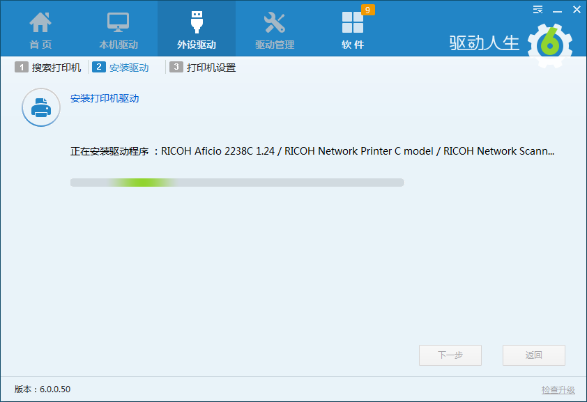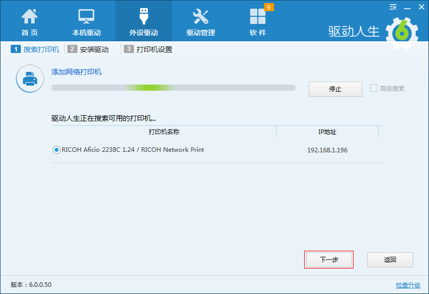 第一步,搜索打印機,搜索局域網內的打印機設備。只要打印機在局域網內,驅動人生就可以搜索到打印機設備的名稱。搜索到打印機后,點擊下一步。
