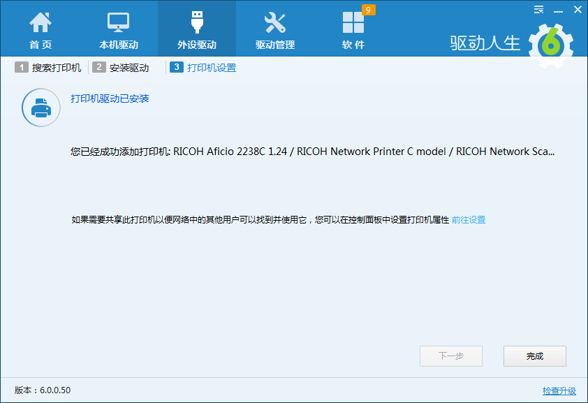 打開驅動人生6,可以看到界面和以前有很大的不用。必備軟件可以直接在首頁上找到,很方便下載。在首頁的右下角,有一個添加打印機的圖標,點擊該圖標就可以進行網絡打印機的設置了。添加網絡打印機,三步搞定。