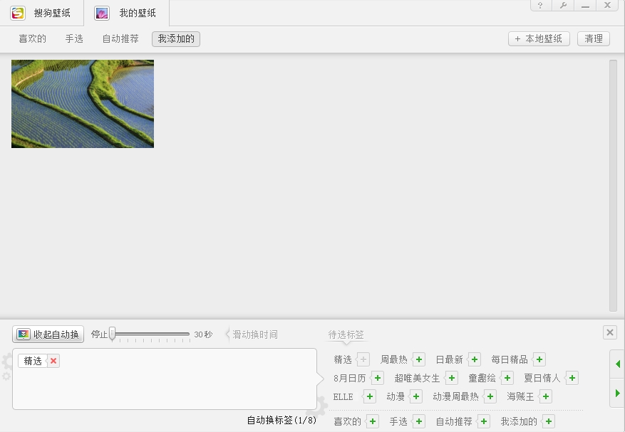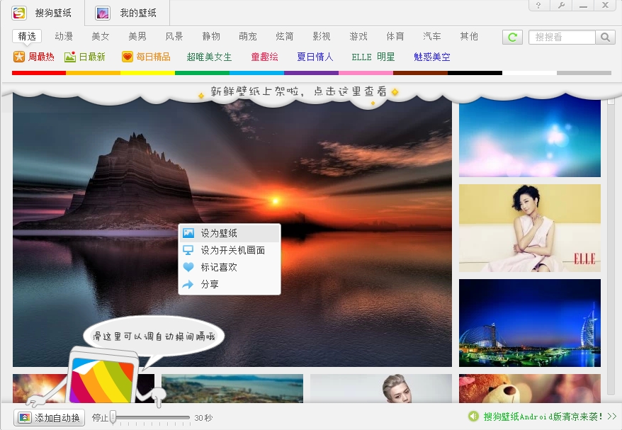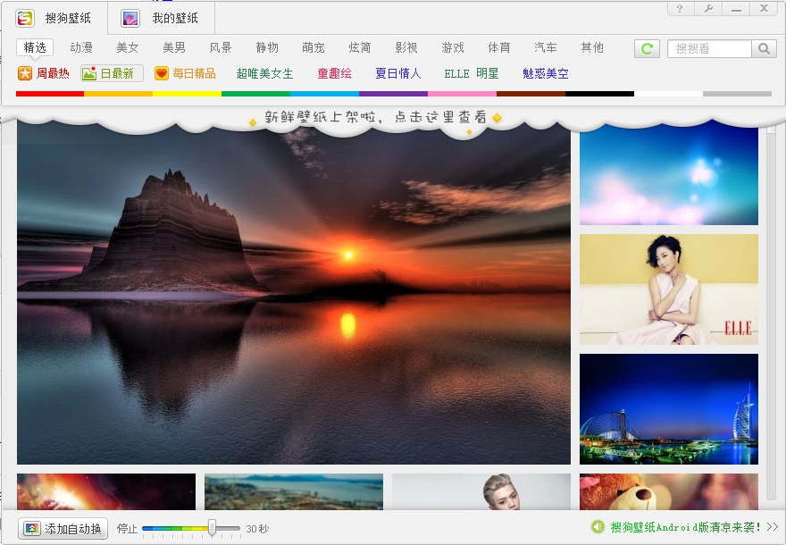 在搜狗壁紙左下角很明顯看到一個(gè)"添加自動(dòng)換"按鈕,這個(gè)功能鍵可以幫你的桌面自動(dòng)換壁紙哦,不過(guò)最大的間隔時(shí)間只有30秒