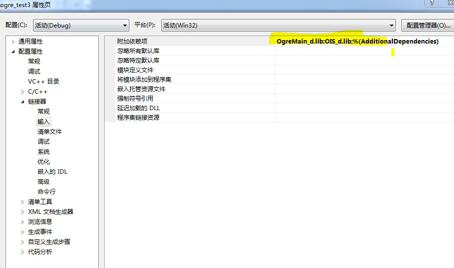 4、在菜單欄依次點擊項目——屬性——配置屬性——鏈接器——輸入中,“附加依賴項”處:添加OgreMain_d.lib和 OIS_d.lib