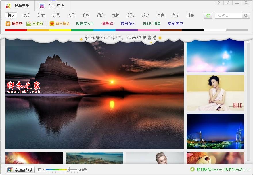 在搜狗壁紙左下角很明顯看到一個"添加自動換"按鈕,這個功能鍵可以幫你的桌面自動換壁紙哦,不過最大的間隔時間只有30秒