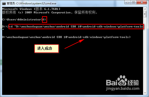 回車 ,然后輸入 cd "D:/anzhuodaquan/anzhuo/android SDK 10/android-sdk-windows/platform-tools"(這個就是上面的目錄,一定要準確 )