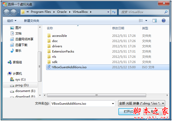 找到VirtualBox安裝目錄,選擇VBoxGuestAdditions.iso,點擊“打開“