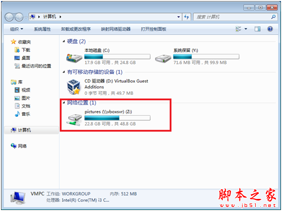 打開虛擬機“計算機“,可以看到共享的文件夾,這樣就可以從虛擬機上訪問指定的主機文件夾了