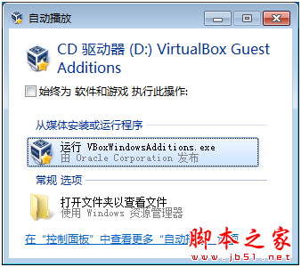 出現“自動播放“對話框,點擊”運行VBoxWindowsAdditions.exe”安裝增強功能。(如果沒有出現“自動播放”對話框,可以在“計算機“中打開虛擬光驅,找到VBoxWindowsAdditions.exe,雙擊進行安裝)