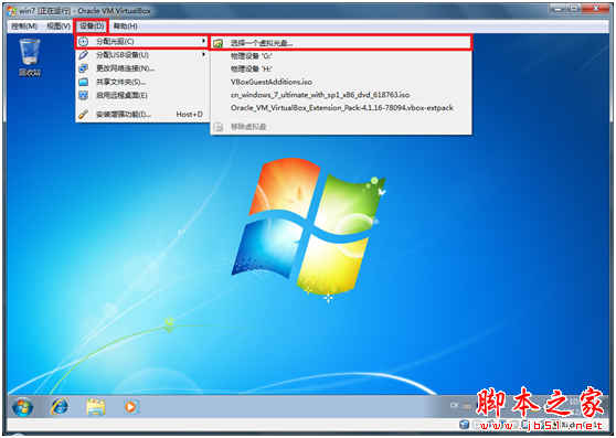 點擊“設備” – “分配光驅“ - ”選擇一個虛擬光盤“,打開”選擇虛擬光盤“對話框