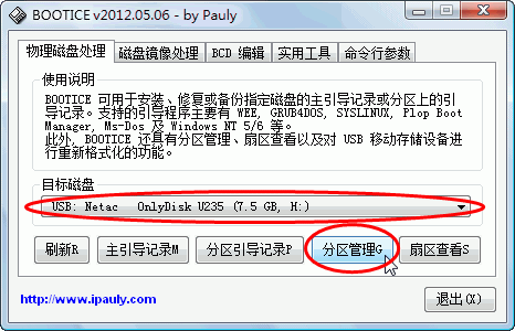 到你的U盤,請手動選擇U盤即可.主界面下方有5個按鈕,選擇第4個按鈕【分區管理】。