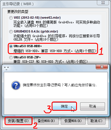 重新插入U盤->重新運行BOOTICE->【主引導記錄】->UltraISO USB-HDD+->安裝/配置->確定->確定->關閉(返回主界面)