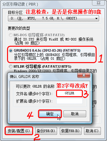 (4)【分區引導記錄】->GRUB4DOS……->安裝/配置->默認文件名GRLDR改成GYLDR->確定->