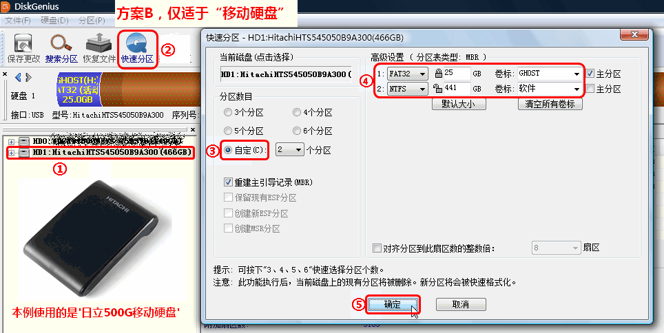 以后按提示操作即可,程序將自動執行分區、格式化、分配盤符等工作,完成后請關閉DiskGenius,拔掉移動硬盤。