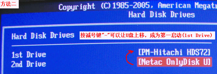 選擇“Hard Disk Drives”回車,按減號“-”鍵或加號“+”鍵改變“1st Drive”和“2nd Drive”兩項的位置,讓U盤最終處于第一啟動(1st Drive)的位置。