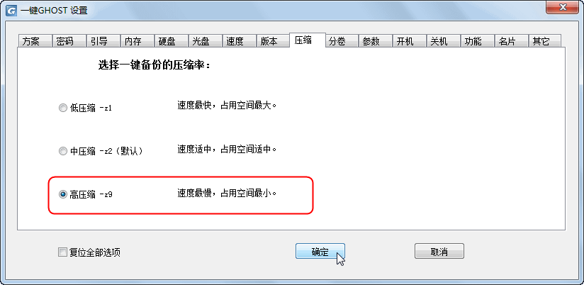 1、準備:使用WINDOWS下運行一鍵GHOST硬盤版->設置->壓縮、分卷