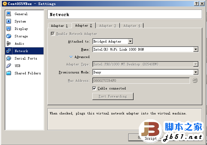 在Vitual Box軟件中選擇該虛擬機,打開網(wǎng)絡(luò)設(shè)置。第一塊網(wǎng)卡是Host-Only方式。點擊Adapter2,配置如圖所示: