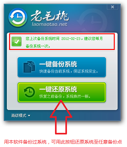 3、備份完畢后重新啟動電腦,打開老毛桃一鍵還原程序即可看到程序自動檢測到剛剛備份了系統。以后當系統中毒或是出現其它問題時點擊一鍵還原系統( 請在還原之前提前備份好系統盤的個人資料,還原時將對C盤原有數據進行覆蓋。 )即可將系統恢復到之前備份的狀態。