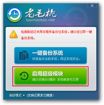 1、啟用超級模塊,能在系統崩潰時DOS狀態下恢復系統,建議啟用。超級模塊允許用戶自定義系統備份文件夾的屬性,可以創建普通文件夾或者畸形文件夾(圖形界面下無法刪除),為了系統備份的安全還可以隱藏備份文件夾或者隱藏系統備份文件所在分區。可以設置密碼保護,防止別人誤操作,@熱鍵啟動的功能類似品牌機的一鍵恢復,可以自定義開機熱鍵,電腦啟動時按下即可立即進入老毛桃一鍵還原界面。