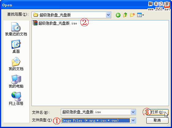 2、選擇"文件類型"為"圖像文件(*.nrg,*.iso,*.cue)" -> 找到"超級急救盤光盤版.ISO"->"打開"
