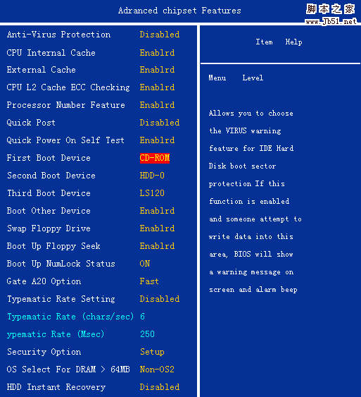 2、用“↓”移動光標到"First Boot Device",用PageDown鍵選擇為"CDROM".