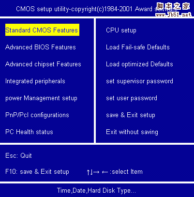 1、開機按“Del”鍵進入CMOS,進入第一項“Standard CMOS Features”,回車.