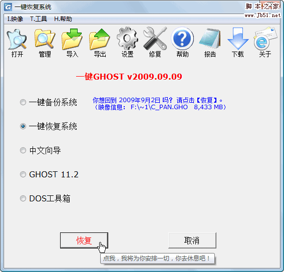 情況2、存在GHO,則出現(xiàn)"恢復(fù)"窗口: