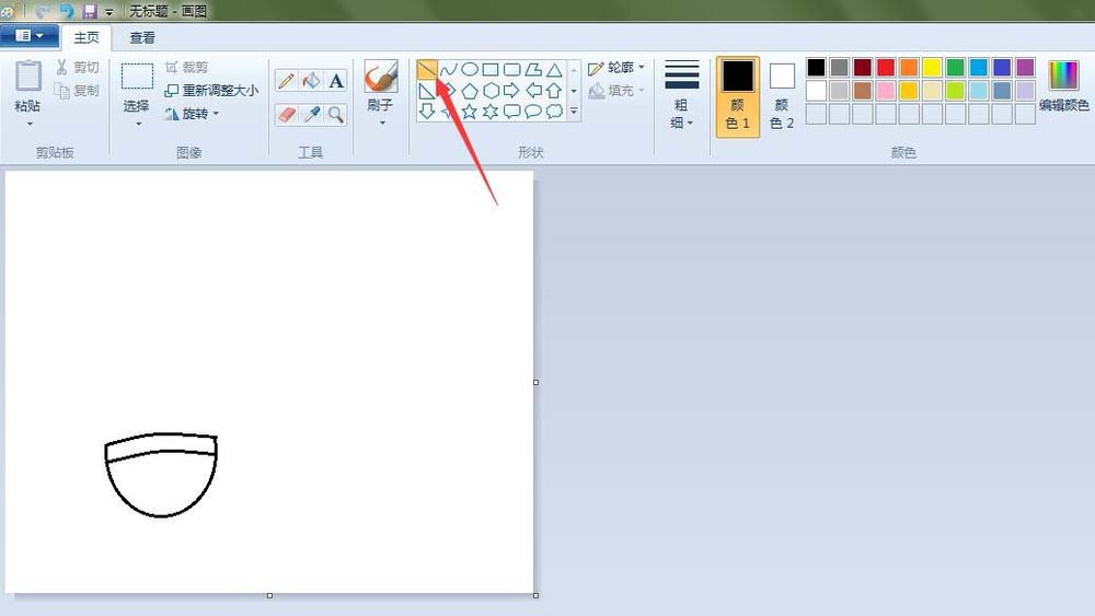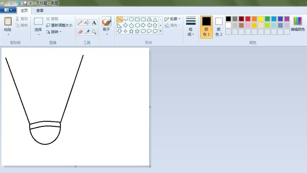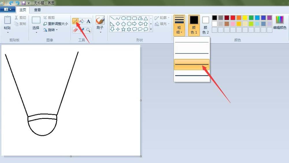 3、羽毛球的羽毛輪廓:點(diǎn)擊“直線”按鈕,在如圖的地方畫兩條直線;點(diǎn)擊“鉛筆”按鈕,線條粗細(xì)(第三個(gè)),在如圖的地方畫出弧度線。