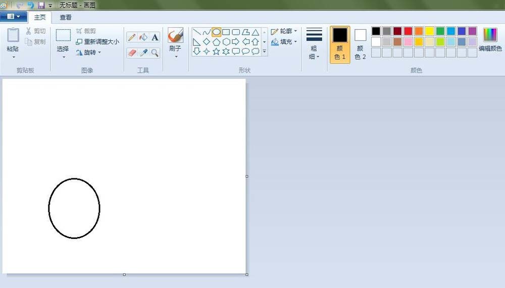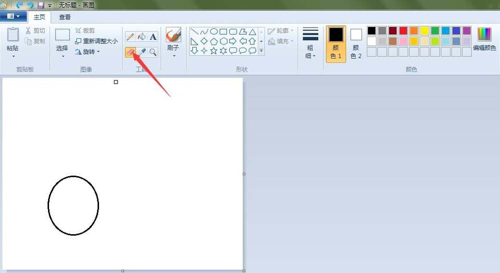 2、羽毛球的頭部:點(diǎn)擊“橢圓形”按鈕,線條粗細(xì)(第二個(gè)),先在“畫紙”適當(dāng)位置上畫上一個(gè)橢圓;點(diǎn)擊“橡皮擦”按鈕,將畫好的橢圓擦掉一些;點(diǎn)擊“曲線”按鈕,在如圖的地方畫兩條曲線。