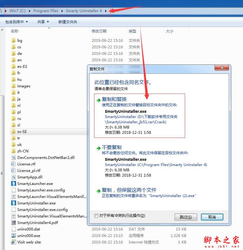 7.將剛剛復制好的文件,粘貼進軟件安裝位置里替換掉之前的文件,如出現下圖提示,點擊“復制和替換”即可(注:軟件安裝位置默認C/Program Files/Smarty Uninstaller 4)
