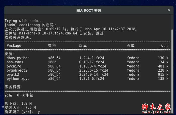 6、如果安裝包郵缺失的話會出現終端讓我們進行安裝缺失的包,輸入密碼然后回車鍵,然后就會進行安裝,中途會讓我們確認是否繼續,輸入“y”,結束后按下回車鍵即可;