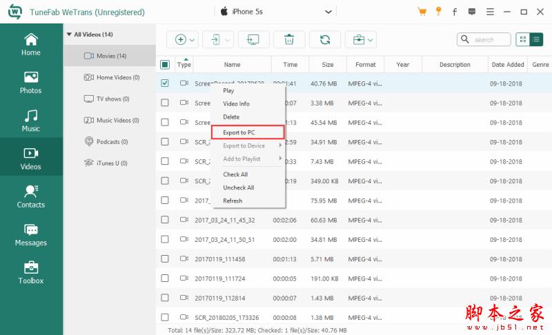 當使用TuneFab WeTrans連接iOS設備時,單擊左側的“視頻”,然后您可以看到iPhone / iPad / iOS設備上的所有視頻。您可以從iOS設備向PC / iOS傳輸大量視頻,例如電影,家庭視頻,電視節目,音樂視頻,播客和iTunes U.