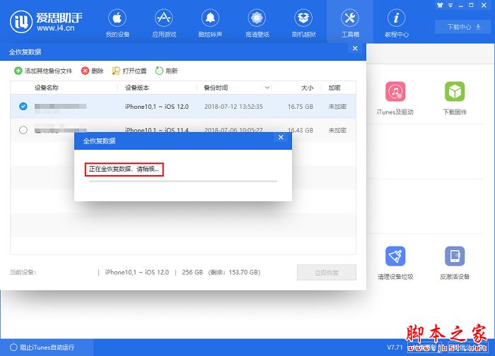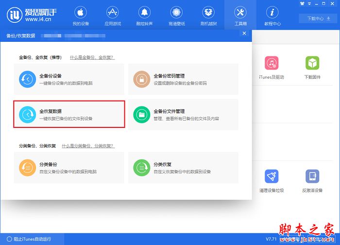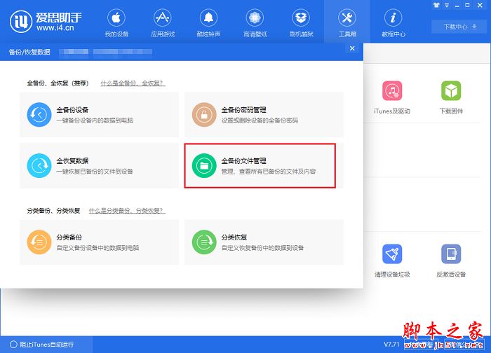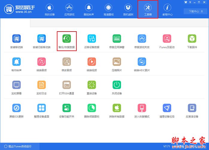 1.首先將設備與電腦連接,打開PC端愛思助手,在【我的設備】中可以直接找到【備份/恢復數(shù)據(jù)】,或者在【工具箱】選項中同樣可以找到【備份/恢復數(shù)據(jù)】按鈕。