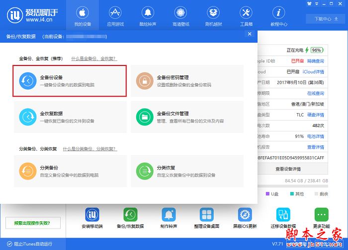 2.選擇【全備份設備】,就可以將設備內(nèi)所有的應用資料都備份在電腦里。(注意,請勿選擇【分類備份】,分類備份只能備份應用清單,無法備份微信聊天記錄)如果想要提高資料的安全程度,您還可以在【全備份密碼管理】中設置備份密碼,當輸入密碼正確時,才可以查看、恢復當前備份記錄,不過請您牢記密碼。