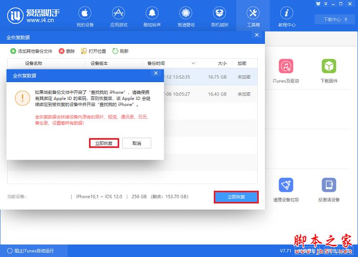 2.選擇備份文件后,點擊【立即恢復】,確認當前設備已關閉【查找我的 iPhone】,再次在確認對話框點擊【立即恢復】。
