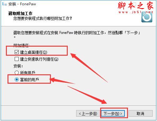 6、創建桌面快捷方式,選擇安裝“當前用戶”,點擊“下一步”