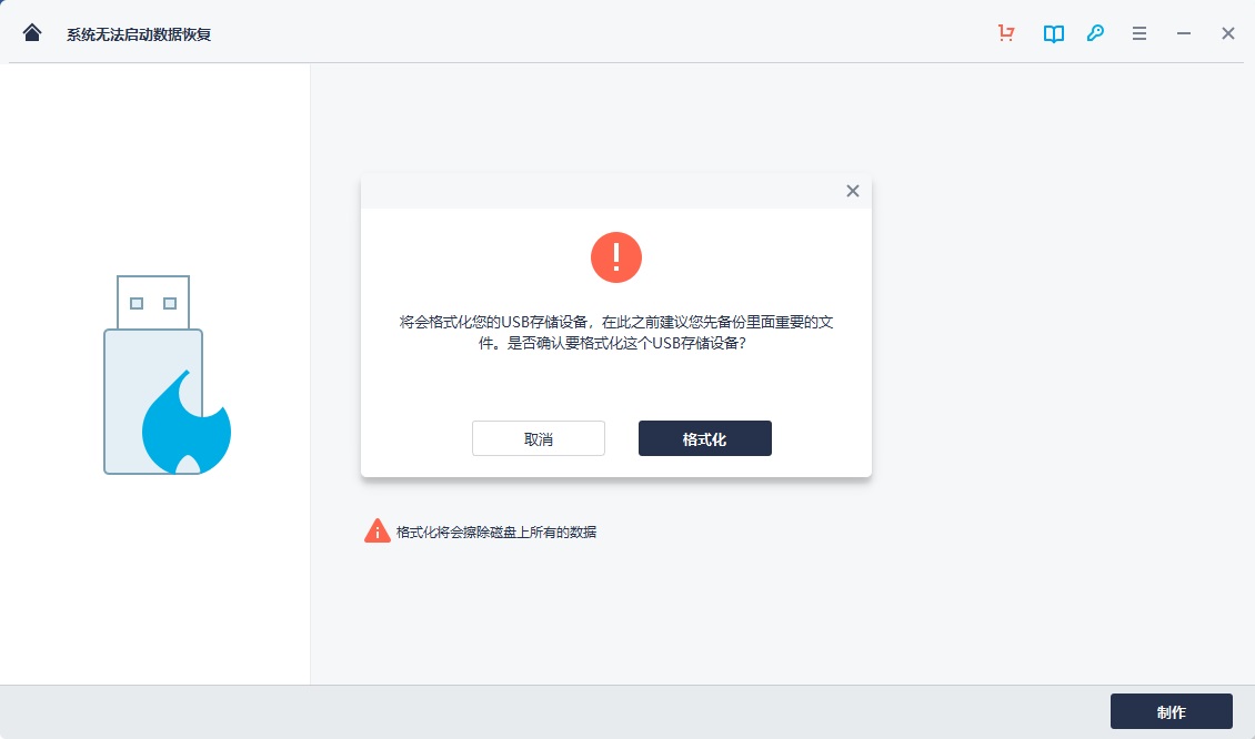 隨后,會有一條警告信息彈出來。請不要被嚇到,那只是提醒你要記得提前備份好啟動盤中的重要數據,以防丟失。若是備份好后,點擊確認“格式化”。