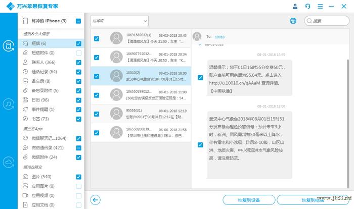 如果您要恢復(fù)的是通訊錄,短信,或者備忘錄這些類型數(shù)據(jù),您只要勾選這些數(shù)據(jù),點擊“恢復(fù)到設(shè)備”萬興蘋果恢復(fù)專家即可將這類找回的數(shù)據(jù)直接保存到iPhone手機(jī)上,減去文件從電腦復(fù)制到iPhone手機(jī)的環(huán)節(jié)。