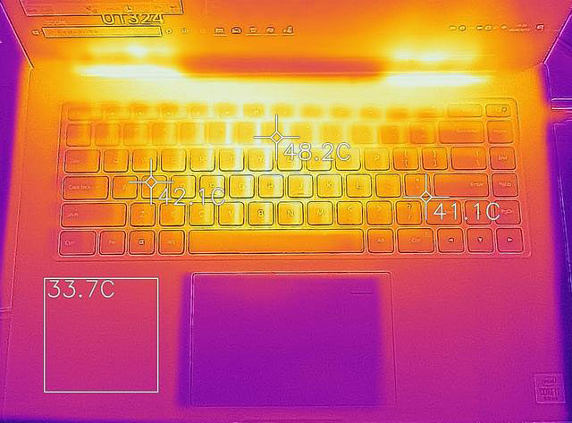 在這種高負載狀態下,WASD按鍵附近的溫度為42℃左右,上排數字鍵和Fn鍵中間位置約48℃,腕托的溫度可以控制在34℃以內,總體來說這樣的實際游戲散熱表現是合格的,可以充分發揮新顯卡的性能