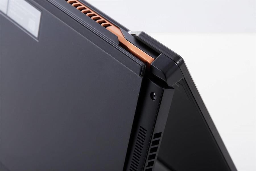 翻開(kāi) A 面的時(shí)候,D 面上多出的一個(gè)面會(huì)翹起來(lái)墊起機(jī)身來(lái)增大加 32% 進(jìn)風(fēng)量,好讓機(jī)身內(nèi)部的熱量更好的散發(fā)出去,這個(gè)就是冰刃系列一直堅(jiān)持的冰川散熱架構(gòu)的一部分。