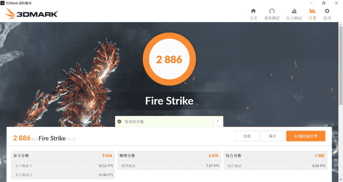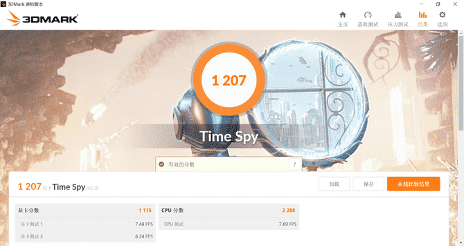 3DMark測(cè)試項(xiàng)目中,我們主要測(cè)試了Time Spy和Fire Strike,兩者的綜合得分分別是1207和2886。