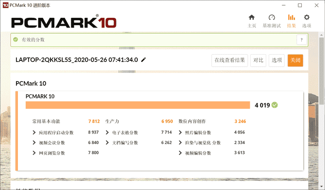 再通過PCMARK 10來測(cè)試該筆記本在單項(xiàng)應(yīng)用場(chǎng)景下的表現(xiàn),常用基本功能得分7812,生產(chǎn)力6950,數(shù)位內(nèi)容創(chuàng)作3246,詳細(xì)得分見下圖。