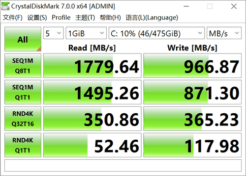 通過CrystalDiskMark檢測(cè),這款512GB固態(tài)硬盤的順序讀取速度為1779.64MB/s,寫入速度為966.87MB/s,512GB的容量,也能滿足辦公應(yīng)用的需求。