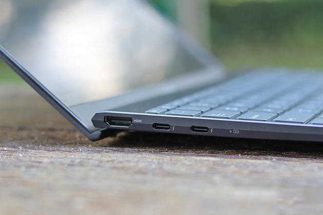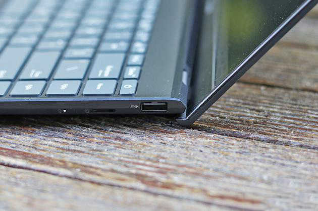 華碩靈耀 14筆記本有著與其身材并不相配的接口豐富程度,在機(jī)身左側(cè)有兩個(gè)雷電 3和一個(gè)全尺寸HDMI,右側(cè)是一個(gè)USB接口和TF卡槽。
