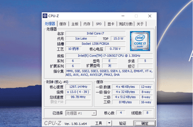 我們先來看看Core i7-1065G7處理器,這是一顆10nm處理器,同時(shí)也是首批10nm U系列處理器中最強(qiáng)型號(hào)。這款處理器擁有四核心八線程規(guī)格,基頻1.3GHz,最大睿頻3.9GHz,三級(jí)緩存8MB,TDP為15W,核顯型號(hào)為Iris Plus Graphics。