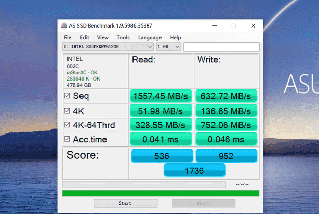 華碩靈耀14配備了PCIE接口的固態(tài)硬盤,這里用AS SSD軟件測(cè)了下讀寫速度,表現(xiàn)中規(guī)中矩,滿足日常辦公足夠了。