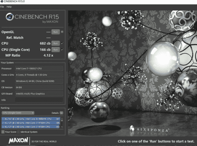 理論性能測(cè)試方面,Cinbench R15多核成績(jī)682cb、單核成績(jī)166cb。從測(cè)試成績(jī)來看,i7-1065G7性能表現(xiàn)并不是特別強(qiáng),與同期14nm U系列處理器性能基本一致。