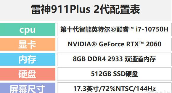 雷神911Plus 2代分為多個配置版本,本次拿到的機型搭載英特爾i7-10750H處理器,NVIDIA GTX1660Ti顯卡,8GB DDR4內存,512GB固態硬盤,以及144Hz電競屏,詳細參數如圖所示:
