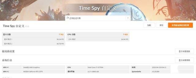 在游戲應用中,火焰、粒子、碰撞、碎裂等等物理特效都需要有高效的處理器來進行渲染運算,通過3DMark Time Spy模式來看,英特爾十代酷睿i7-10750H處理器在這方面擁有極佳的性能表現,其CPU評分高達7422分,相對于九代酷睿來說提升不少。