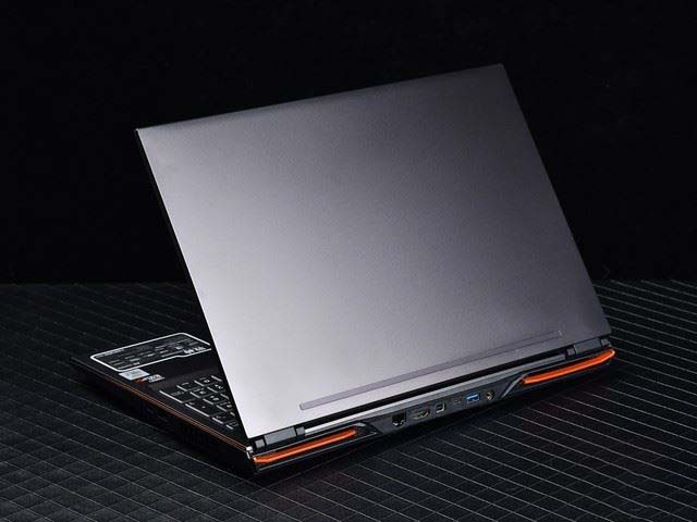 神舟戰神Z9整體外觀設計簡約,采用了黑色配色以及橘黃色裝飾線條。頂蓋表面光滑,通過金屬噴砂工藝很好的保留了金屬質感與觸感。