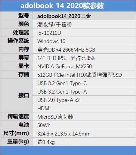 2020年初a豆一口氣推出了2款筆記本,分別是adolbook13 2020與adolbook14 2020。這也是a豆2020年“潮流有色計劃”的最直接體現。首批上市的是14英寸的adolbook14 2020詳細配置參數如下: