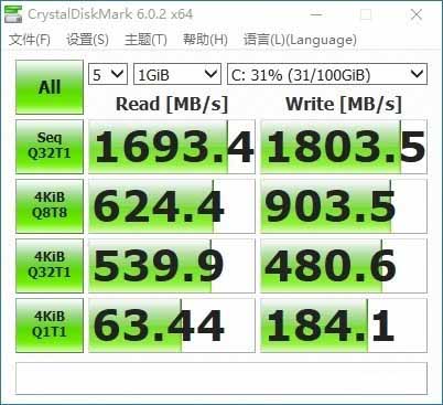 雷神MixBook Air采用了16GB雙通道內存,為板載8GB+插槽8GB。這一設計思路也符合當下用戶自行升級的需求。硬盤為1TB PCIe3.0×4 SSD,而且機身內部共有兩個M.2硬盤位,用戶還可以進行升級。實測這塊硬盤持續讀取1693MB/s、持續寫入1803MB/s,4K隨機讀取63.44MB/s、4K隨機寫入184.1MB/s。從測試結果來看,這塊固態硬盤的性能還是挺不錯的,特別是4K性能已經達到旗艦級別。