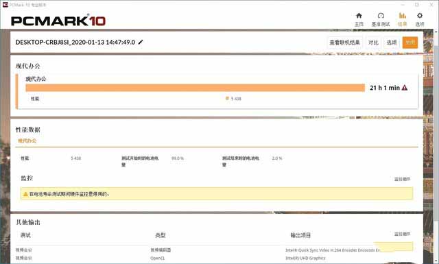 作為一款重量只有1.065kg的輕薄本,最讓我驚訝的就是其電池容量。雷神MixBook Air采用了一塊容量高達72Wh的電池,非??鋸?。更夸張的是它的續航能力,我使用PCMark10對其進行續航測試,測試模式為現代辦公,屏幕亮度為150cd/m2,連接Wi-Fi,音量50%,最終得到21小時1分鐘的續航成績。該成績在14英寸輕薄本中已經處于絕對領先優勢。